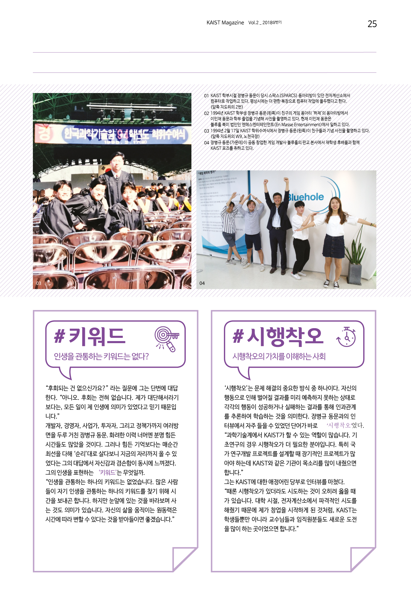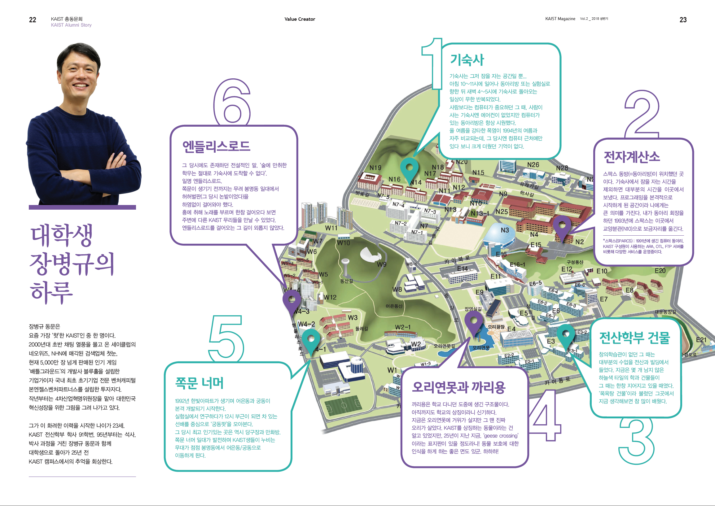 장병규 동문은 요즘 가장 ‘핫’한 KAIST인 중 한 명이다.2000년대 초반 채팅 열풍을 몰고 온 세이클럽의 네오위즈, NHN에 매각된 검색업체 첫눈, 현재 5,000만 장 넘게 판매된 인기 게임 ‘배틀그라운드’의 개발사 블루홀을 설립한 기업가이자 국내 최초 초기기업 전문 벤처캐피털 본엔젤스벤처파트너스를 설립한 투자자다.