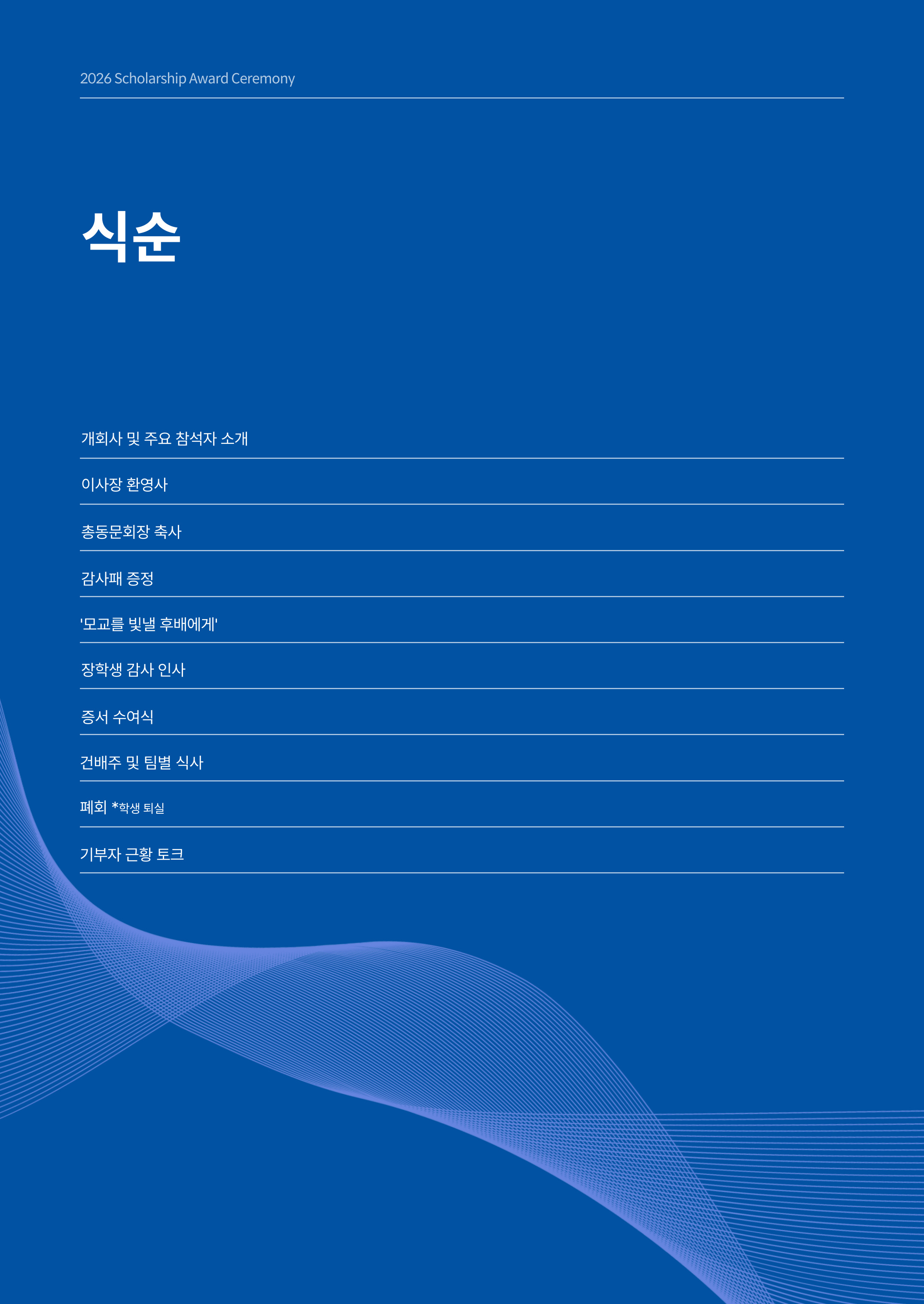 행사는 박병찬 장학생이 사회를 맡아, 다음과 같은 순서로 진행되었습니다.