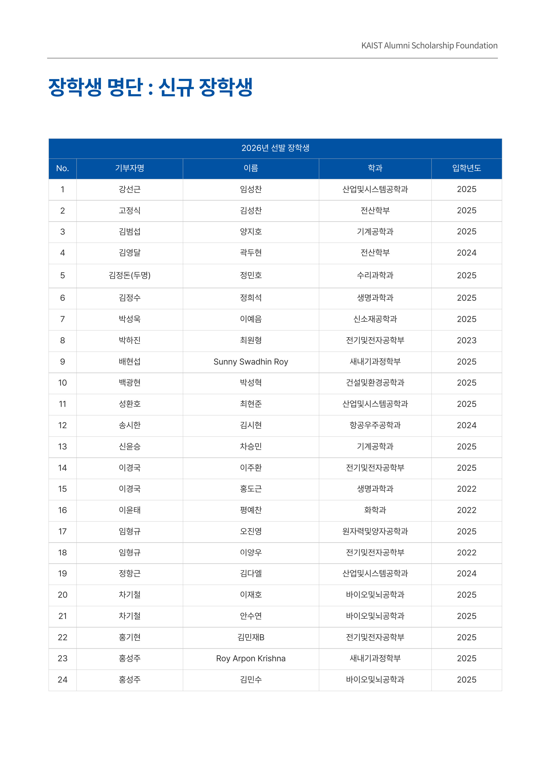 2026년 동문학술장학재단은 새롭게 선발된 신규장학생 24명과 기존장학생 88명, 총 112명의 장학생들에게 장학금을 지급할 예정입니다.